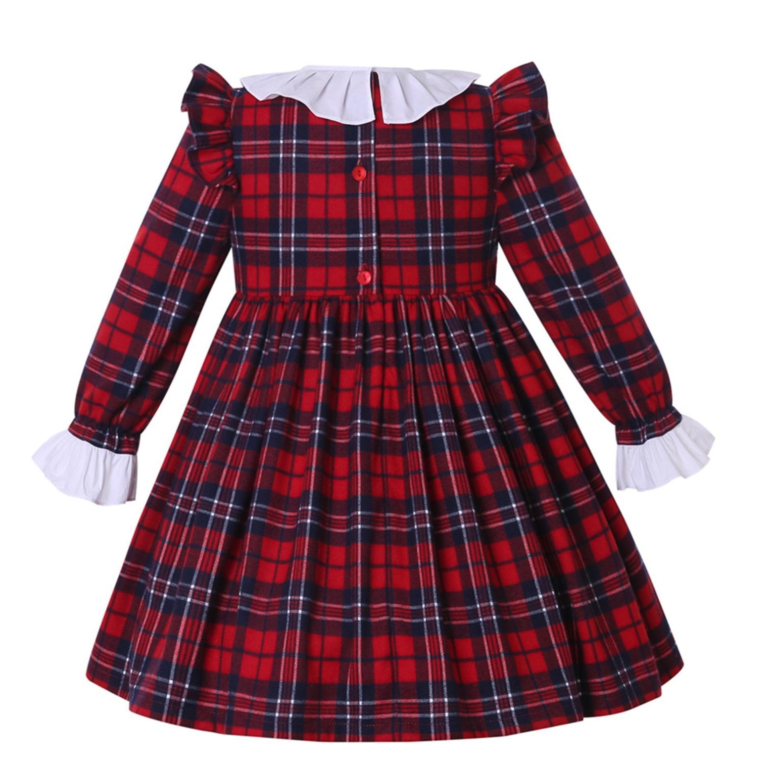 Embrace the holiday spirit with Noelle, a charming plaid dress in festive red and navy. This delightful piece features a classic tartan pattern, a sweet white Peter Pan collar with pleated details, white ruffled cuffs, and a red satin bow accent at the chest with hand-smocked detailing.