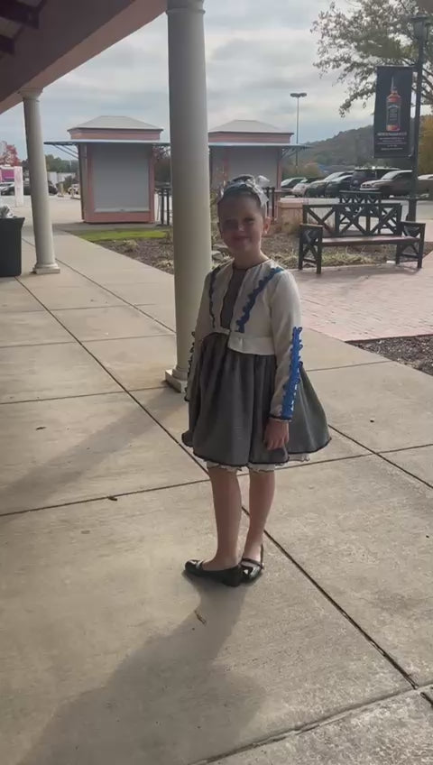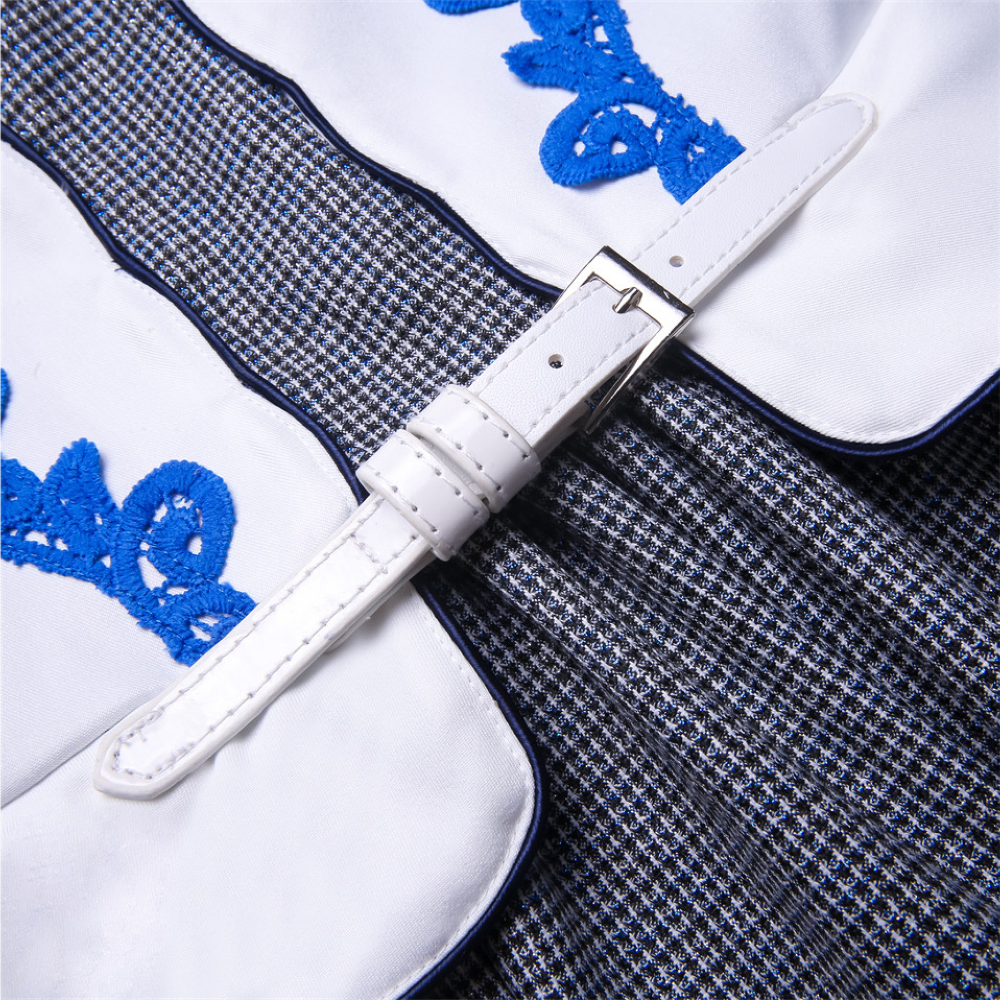 A knee-length girl's dress with a checkered pattern, featuring a white jacket with blue embroidery and a white belt, paired with a bow headband.