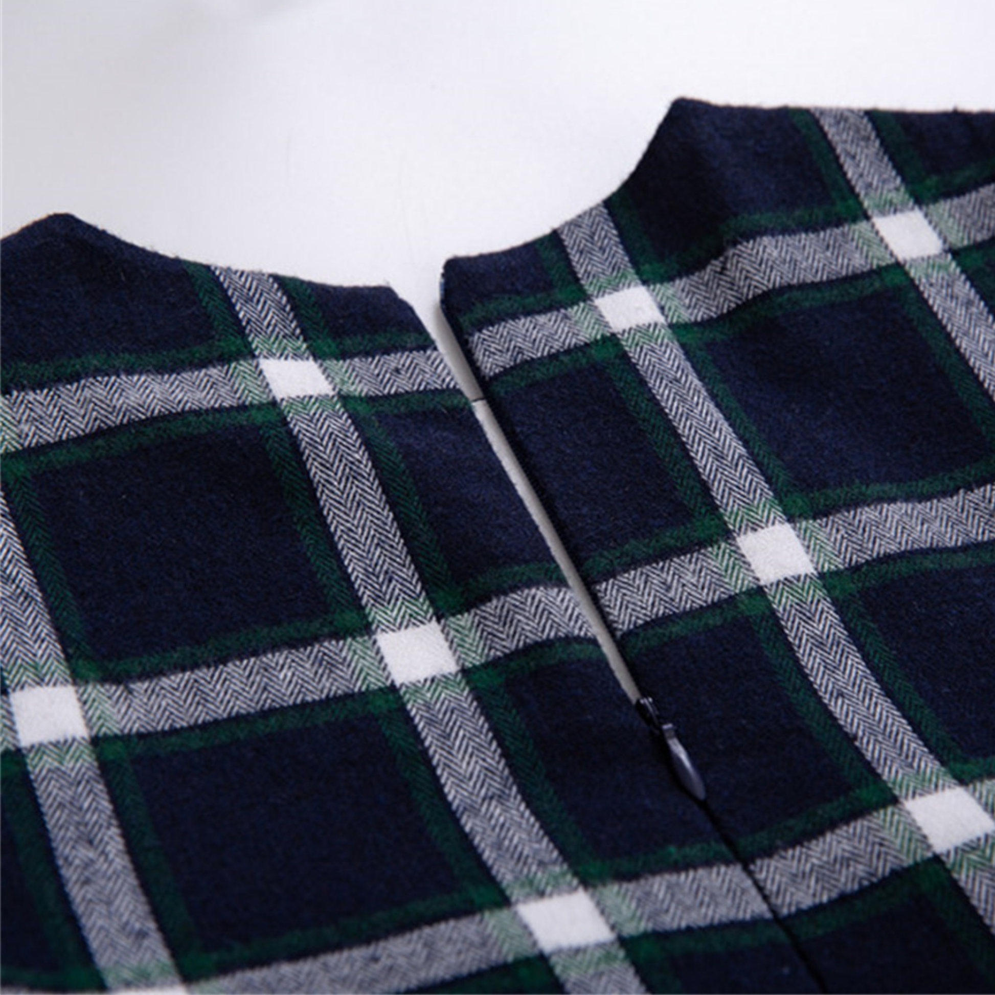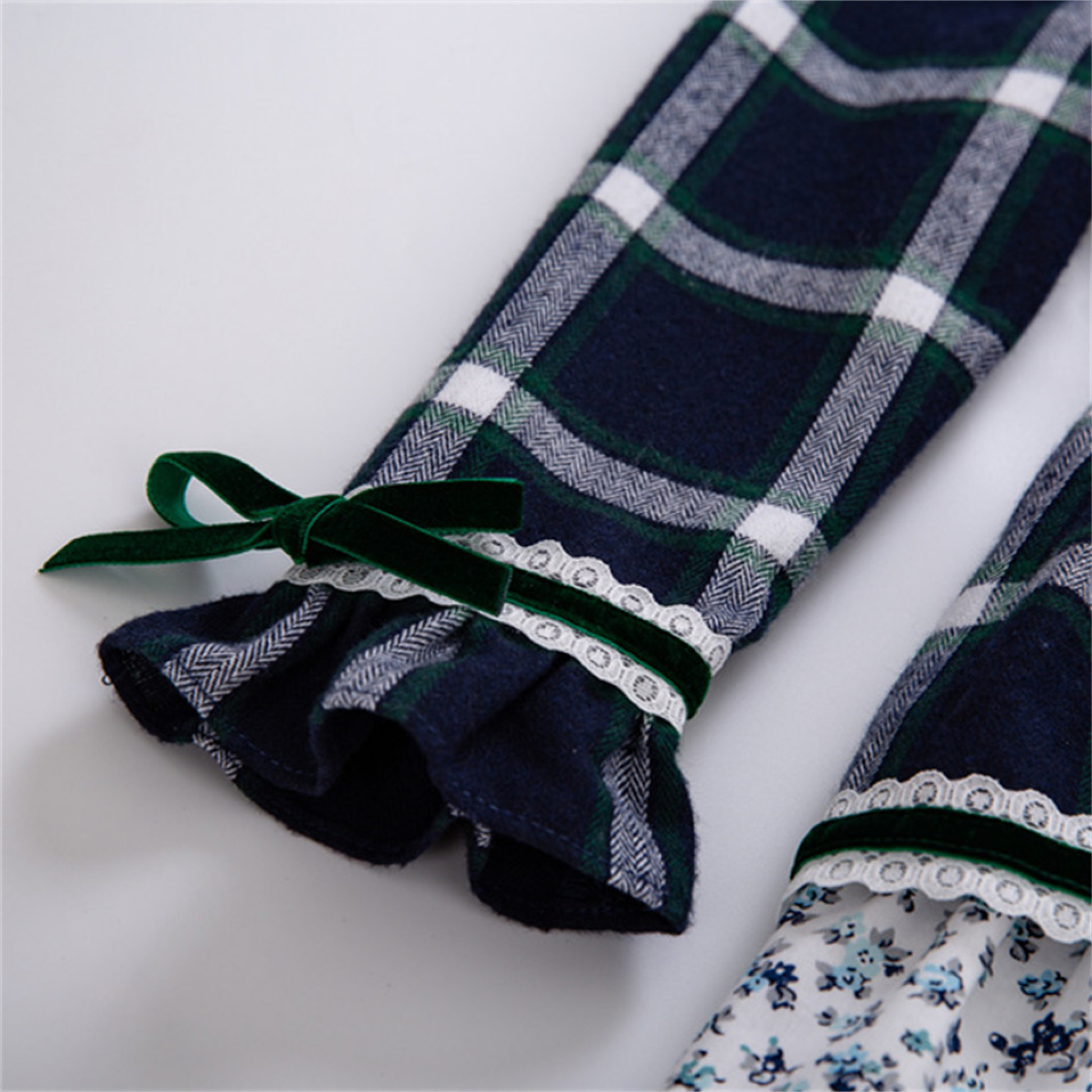The Sofia is a sophisticated navy plaid dress featuring a delicate white floral ruffle waistband, emerald velvet bow, and a charming layered floral hem. A timeless, garden-meets-classic look.